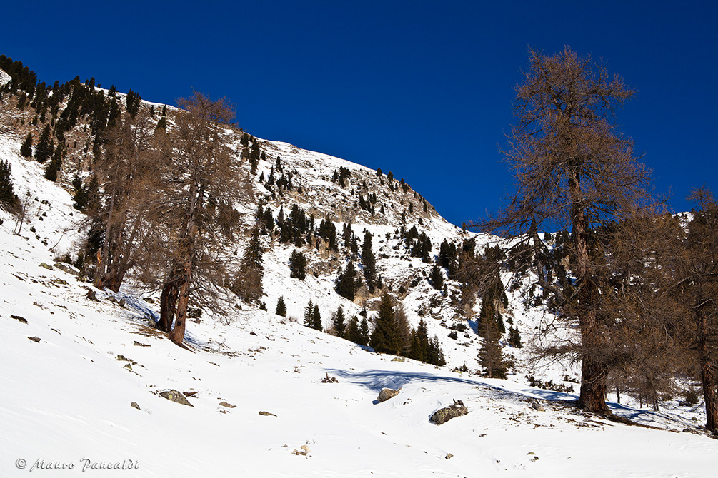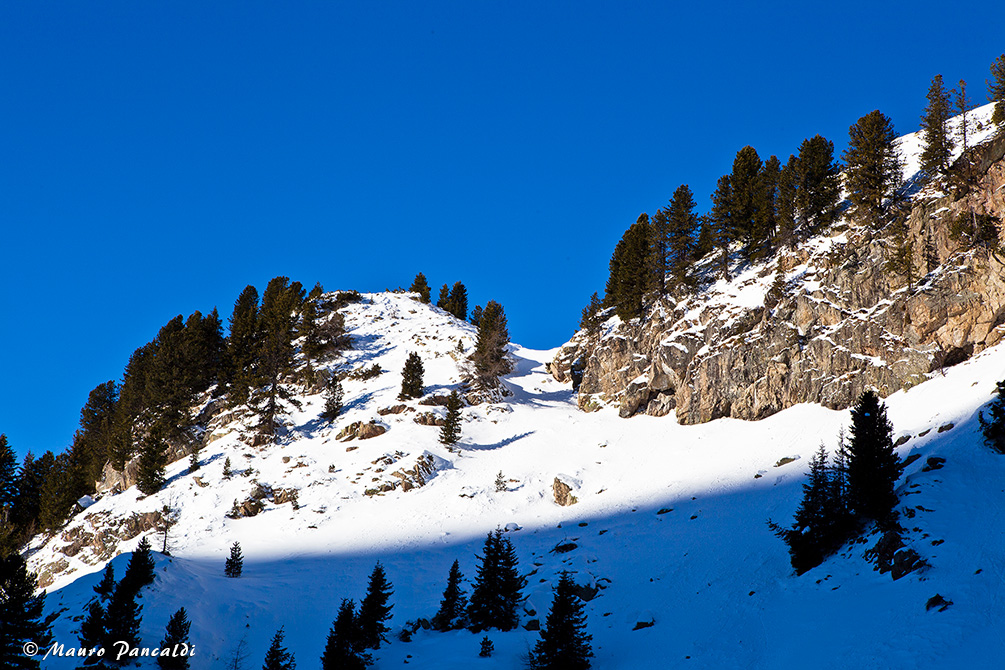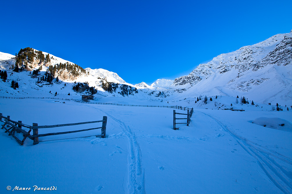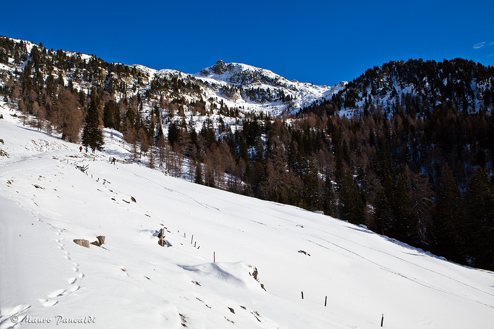 Lungo la pista che risale il fianco settetrionale della Valle di Tramin nei pressi della Seebergalmhutte.Lungo la pista che risale il fianco settetrionale della Valle di Tramin nei pressi della Seebergalmhutte.