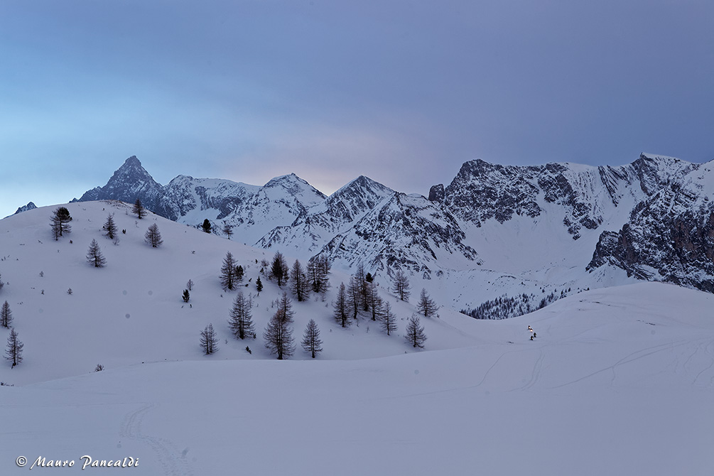 Lunga la pista innevata che risale la Val Servierettes.Lunga la pista innevata che risale la Val Servierettes.