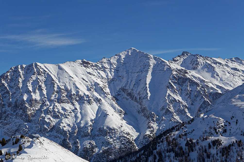 Sul profilo di neve sferzato dal vento si alza imponente il Monte Chaberton.Sul profilo di neve sferzato dal vento si alza imponente il Monte Chaberton.