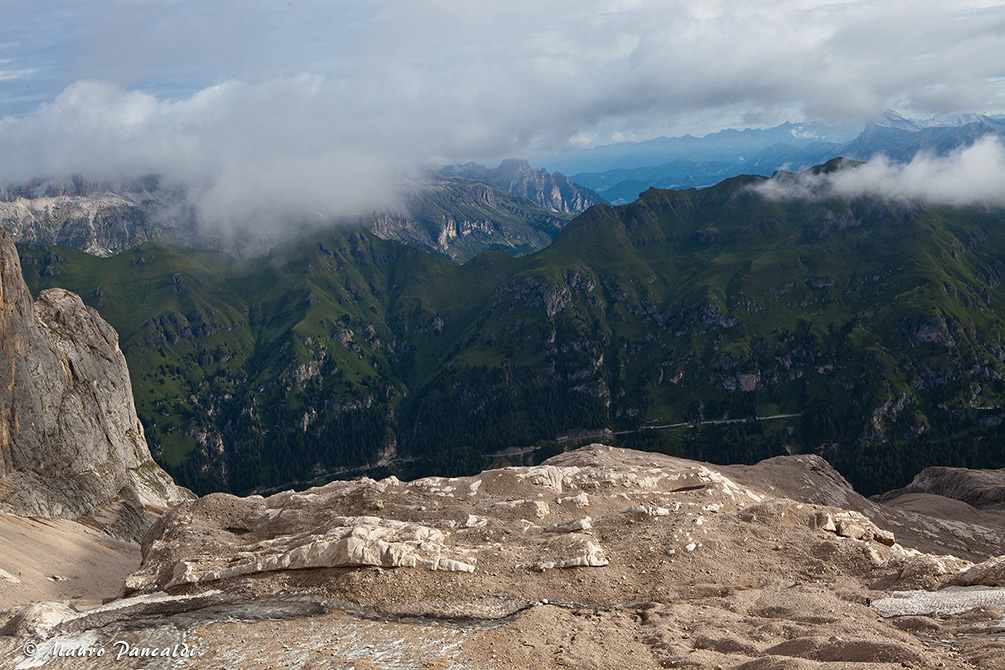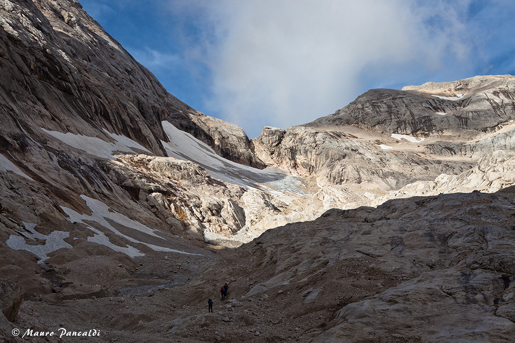 Sopra Pian dei Fiacconi il ghiacciaio ritirandosi ha scoperto una vasta placconata di calcare chiarissimo.Sopra Pian dei Fiacconi il ghiacciaio ritirandosi ha scoperto una vasta placconata di calcare chiarissimo.