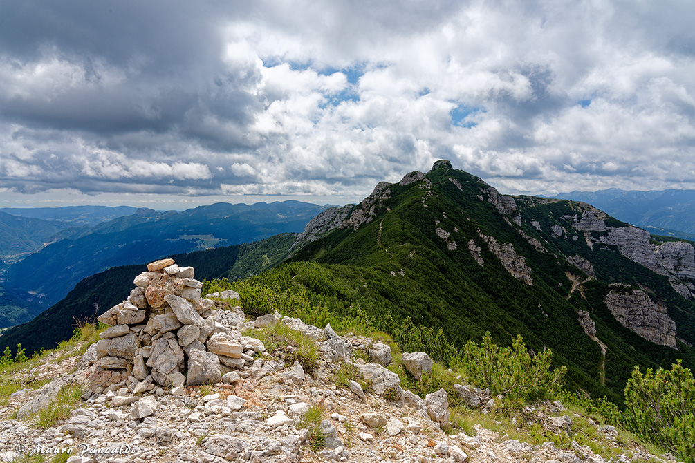 Ometto di vetta della Seconda Cima, sullo sfondo il Cornetto di Folgaria.Ometto di vetta della Seconda Cima, sullo sfondo il Cornetto di Folgaria.