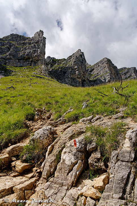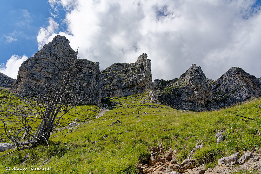 Sul ripido crinale prativo di Pra Longo che risale l’arco vallivo de la Fricca.Sul ripido crinale prativo di Pra Longo che risale l’arco vallivo de la Fricca.