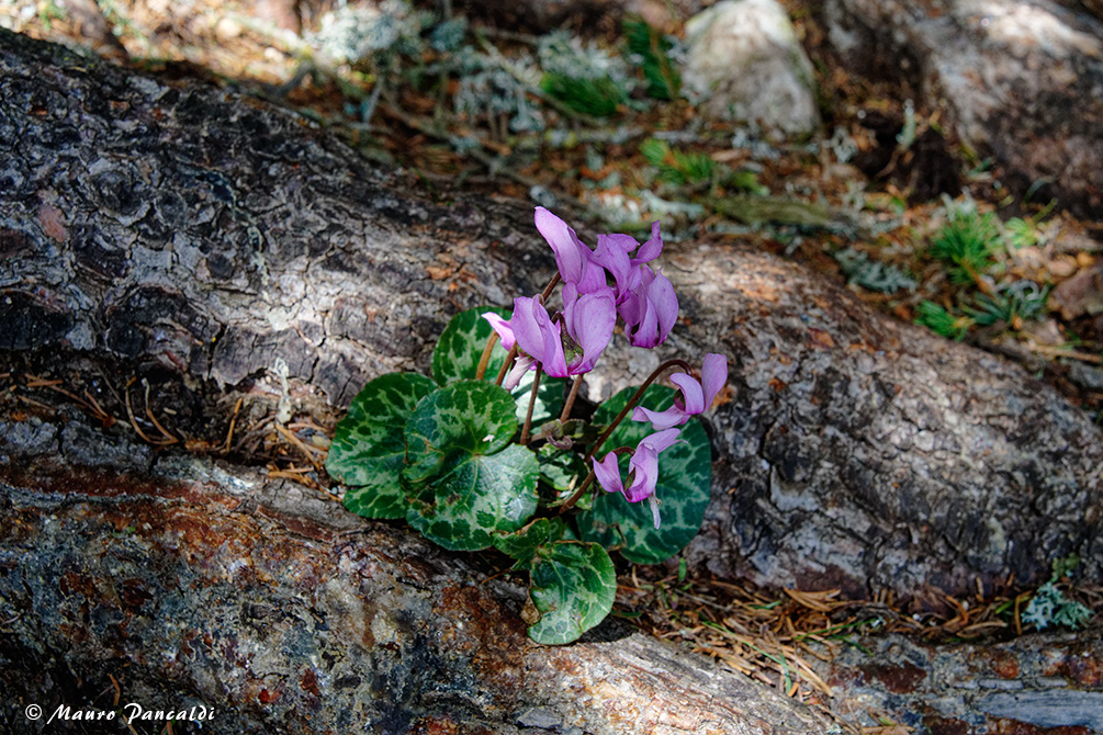 Un grazioso Ciclamino delle Alpi (Cyclamen purpurascens Miller) cresciuto tra le radici di un larice (Val Rossa).Un grazioso Ciclamino delle Alpi (Cyclamen purpurascens Miller) cresciuto tra le radici di un larice (Val Rossa).
