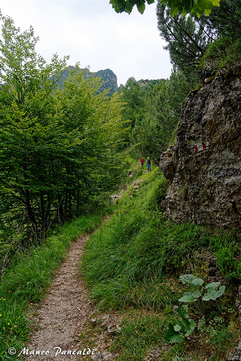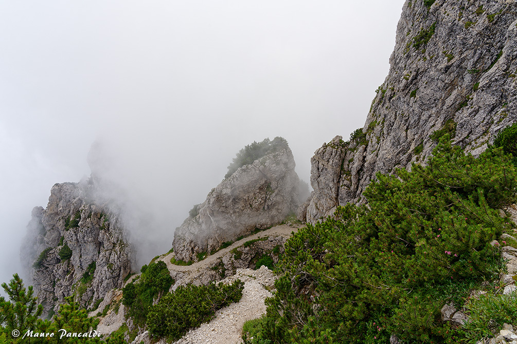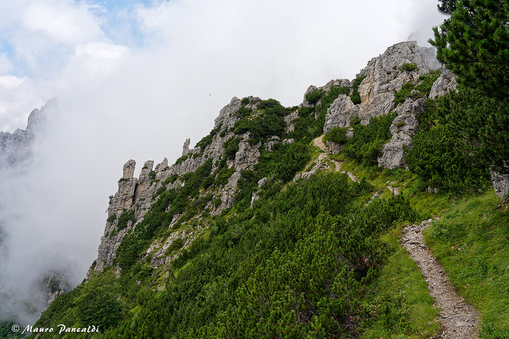 La mulattiera militare s’insinua tra le guglie rocciose sul fianco del Monte Cornetto.La mulattiera militare s’insinua tra le guglie rocciose sul fianco del Monte Cornetto.