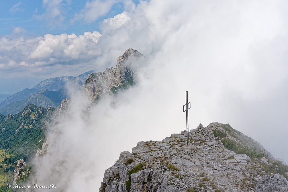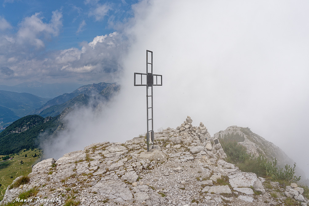 La croce di Cima Baffelan, sullo sfondo per un attimo le nuvole lasciano intravedere anche la cima del Monte Cornetto.La croce di Cima Baffelan, sullo sfondo per un attimo le nuvole lasciano intravedere anche la cima del Monte Cornetto.