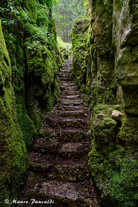 La trincea s’insinua quasi soffocata dalle rocce coperte di muschio.La trincea s’insinua quasi soffocata dalle rocce coperte di muschio.
