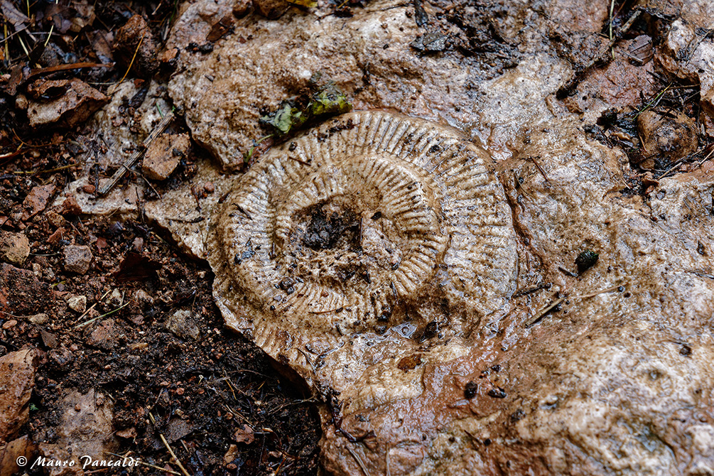 Ammonita fossile tra le rocce del sentiero (Forra del Lupo).Ammonita fossile tra le rocce del sentiero (Forra del Lupo).