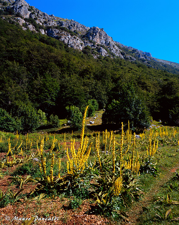 Le gialle spighe del Verbasco o Tasso Barbasso (Verbascum thapsus) adornano un’ampia radura prativa lungo il Vallone di Teve.Le gialle spighe del Verbasco o Tasso Barbasso (Verbascum thapsus) adornano un’ampia radura prativa lungo il Vallone di Teve.