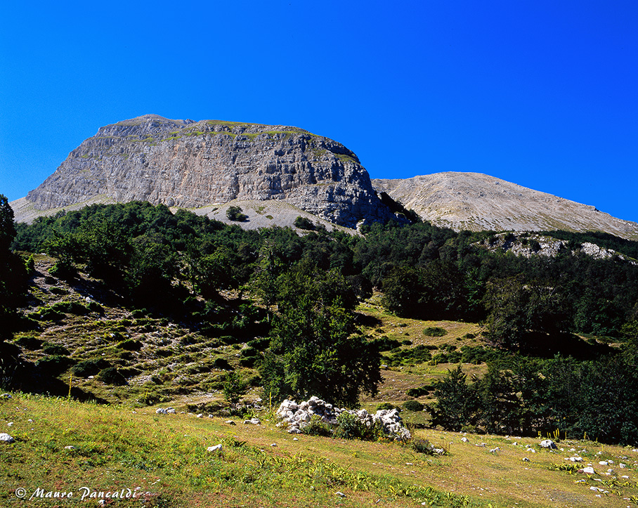 La grande muraglia rocciosa di Rava Palazzo domina i prati di Capo di Teve.La grande muraglia rocciosa di Rava Palazzo domina i prati di Capo di Teve.