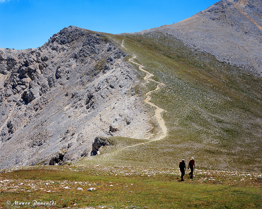 Il marcato sentiero che segue la Cresta Nord-Ovest del Velino (ripreso dal Costognillo)Il marcato sentiero che segue la Cresta Nord-Ovest del Velino (ripreso dal Costognillo)