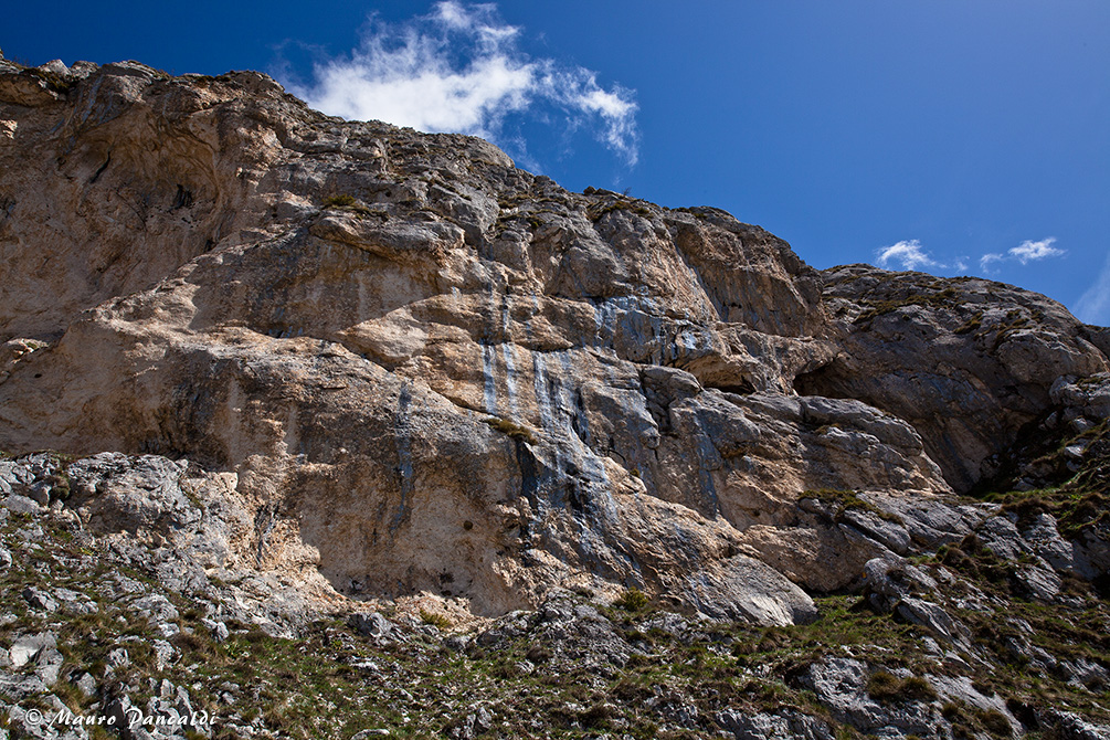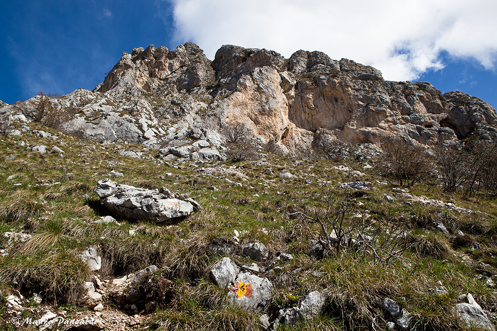 Ai piedi dei contrafforti rocciosi della Cresta Sud-occidentale del Velino, dove si apre la Grotta di San Benedetto.Ai piedi dei contrafforti rocciosi della Cresta Sud-occidentale del Velino, dove si apre la Grotta di San Benedetto.