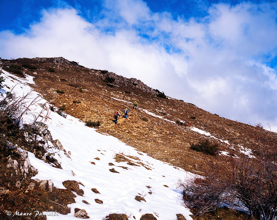 In cammino sul sentiero che traversa sopra Fonte Furapà (Passo delle Capannelle).In cammino sul sentiero che traversa sopra Fonte Furapà (Passo delle Capannelle).