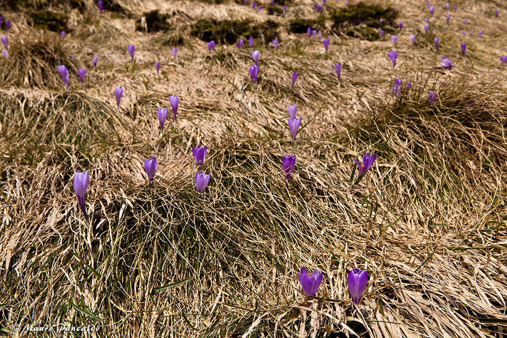 Fioritura di crochi, ovvero Zafferano maggiore, sui prati appena lasciati liberi dalla neve (Cresta Nord di Cima a Mare).Fioritura di crochi, ovvero Zafferano maggiore, sui prati appena lasciati liberi dalla neve (Cresta Nord di Cima a Mare).