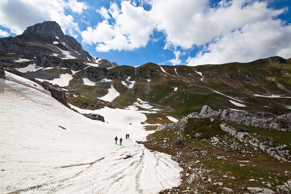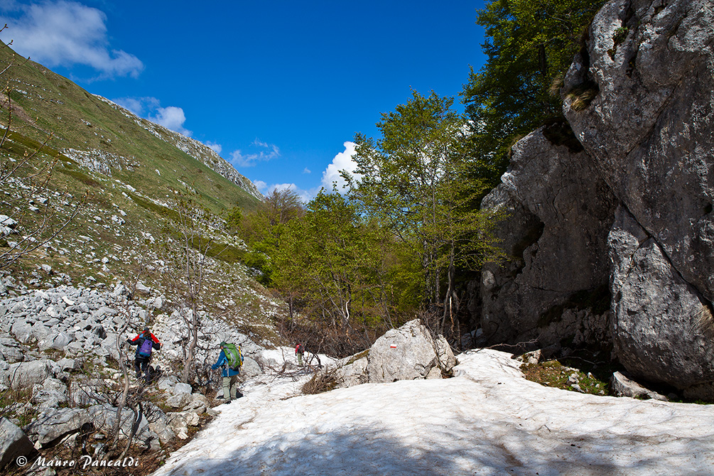 Lungo un nevaio che ci accompagna sul fondo della Valle Pagana.Lungo un nevaio che ci accompagna sul fondo della Valle Pagana.
