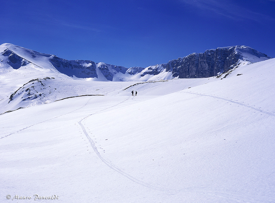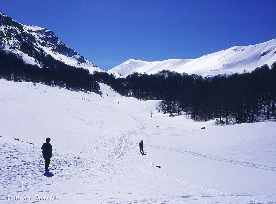 Dal Passo del Morretano la vista si apre sulla parte finale della Valle Leona, il Rifugio Sebastiani è solo un puntino sperduto sulla neve.Dal Passo del Morretano la vista si apre sulla parte finale della Valle Leona, il Rifugio Sebastiani è solo un puntino sperduto sulla neve.