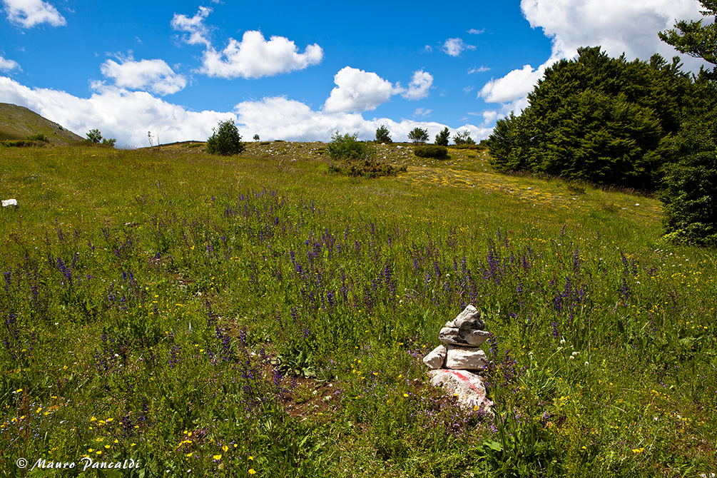 Un ometto lungo la Cresta Nord dell’Orsello ci indica la direzione per l’ampia conca pascoliva del Matrone.Un ometto lungo la Cresta Nord dell’Orsello ci indica la direzione per l’ampia conca pascoliva del Matrone.