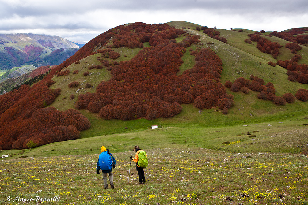 Sui pascoli di Bocca Mezzana, sullo sfondo si nota il bosco di faggi bruciato da una tardiva gelata primaverile.Sui pascoli di Bocca Mezzana, sullo sfondo si nota il bosco di faggi bruciato da una tardiva gelata primaverile.