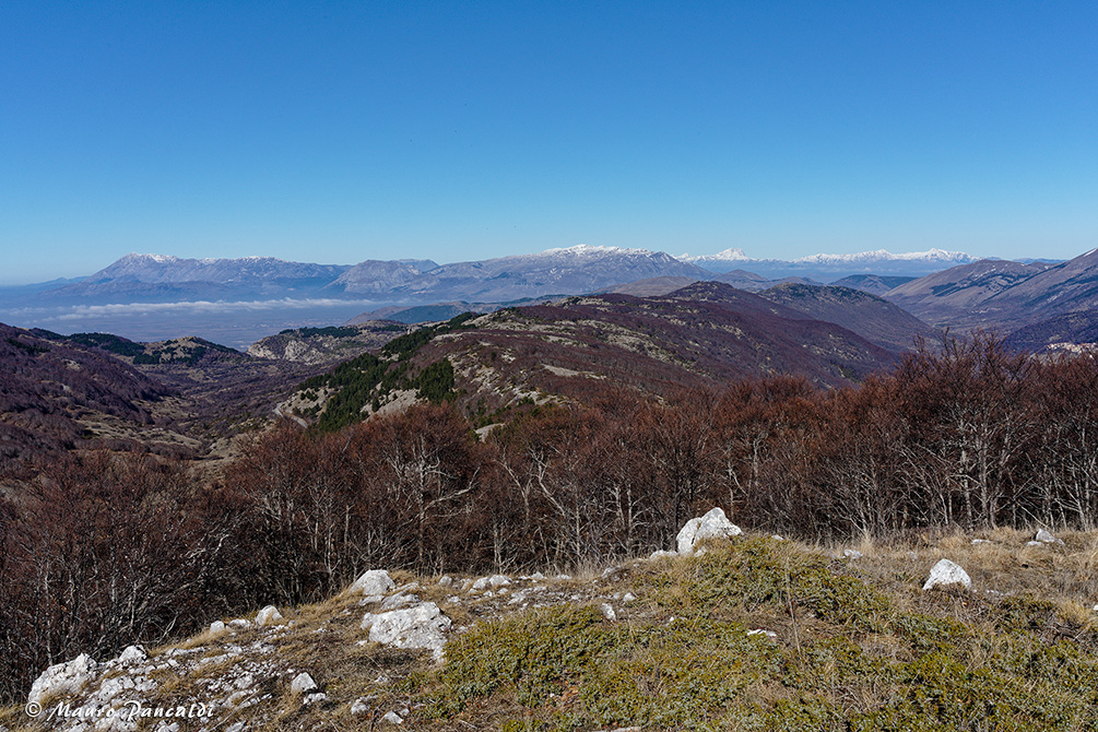 Vista dalla cima del Morrone del Diavolo verso nord-ovest, sullo sfondo si vede la catena del Velino-Sirente.Vista dalla cima del Morrone del Diavolo verso nord-ovest, sullo sfondo si vede la catena del Velino-Sirente.