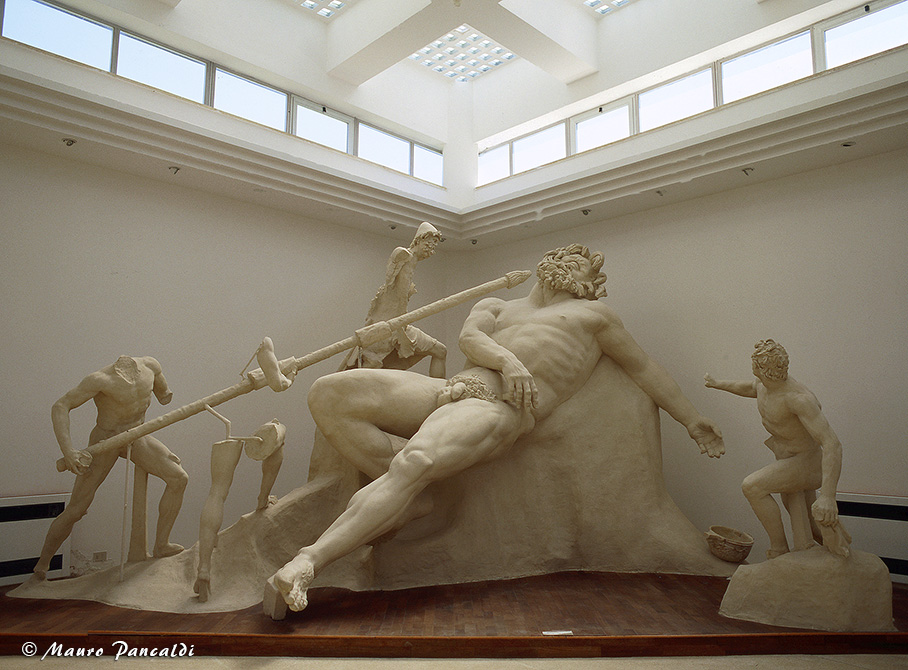 Ricostruzione del principale gruppo scultoreo che si trovava al centro della Grotta di Tiberio: l’accecamento di Polifemo (Museo della Villa di Tiberio).Ricostruzione del principale gruppo scultoreo che si trovava al centro della Grotta di Tiberio: l’accecamento di Polifemo (Museo della Villa di Tiberio).