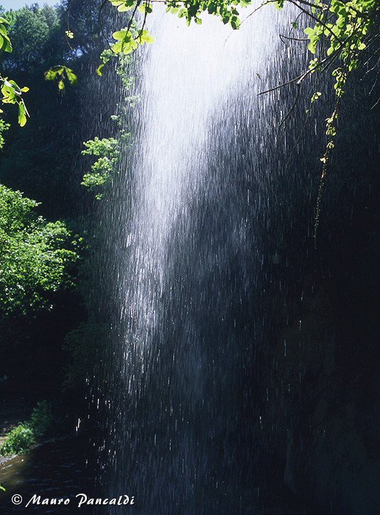 La prima Cascata della Mola vista in controluce dalla volta rocciosa che si nasconde dietro ad essa.La prima Cascata della Mola vista in controluce dalla volta rocciosa che si nasconde dietro ad essa.