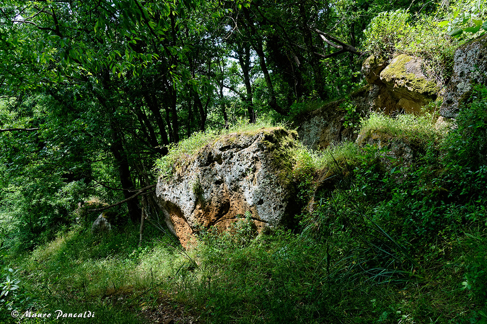 Un raggio di sole colora un masso tufaceo nel Fosso del Vesca.Un raggio di sole colora un masso tufaceo nel Fosso del Vesca.