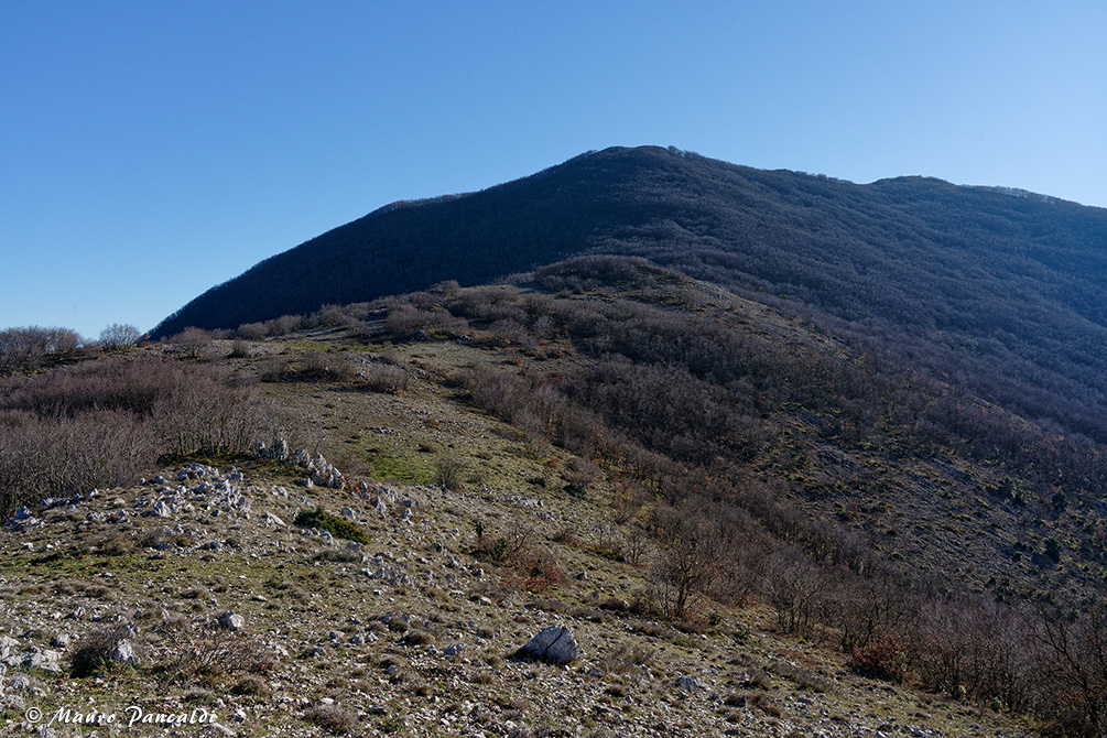 Poco prima di guadagnare la cresta sommitale vista sul Monte Sammucro o Sambucaro, in primo piano il boscoso Colle Cannavinelle, e sullo sfondo a sx fa capolino il Monte Cairo.Poco prima di guadagnare la cresta sommitale vista sul Monte Sammucro o Sambucaro, in primo piano il boscoso Colle Cannavinelle, e sullo sfondo a sx fa capolino il Monte Cairo.