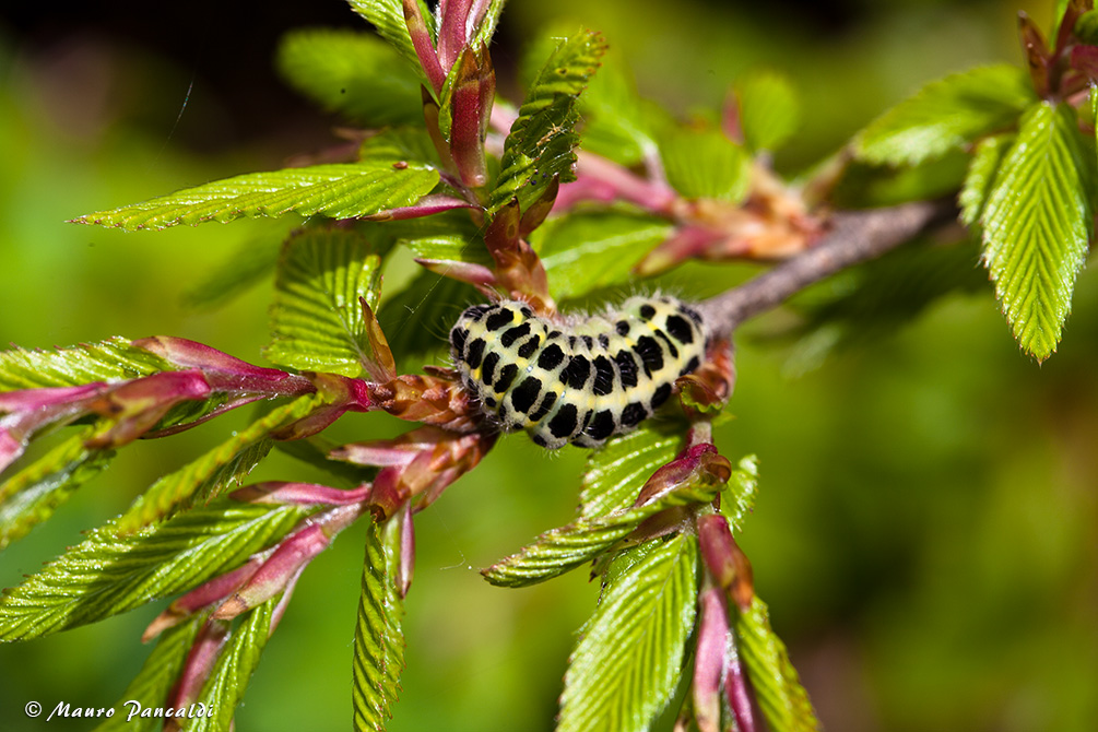 Bruco su foglioline di carpino (probabile Cucullia scrophulariae, mulattiera per Colle San Domenico nei pressi de la Portella).Bruco su foglioline di carpino (probabile Cucullia scrophulariae, mulattiera per Colle San Domenico nei pressi de la Portella).