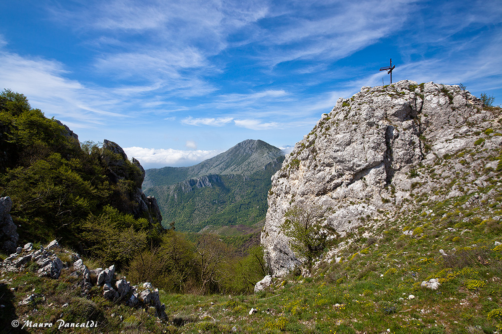 Sulla selletta che precede la cima di Monte Corno (sulla sx, quella con la croce è un’anticima), sullo sfondo fa capolino il Monte Sambucaro.Sulla selletta che precede la cima di Monte Corno (sulla sx, quella con la croce è un’anticima), sullo sfondo fa capolino il Monte Sambucaro.