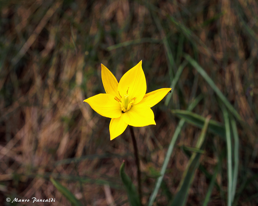 Un radioso fiore di Tulipano dei campi o selvatico (Tulipa sylvestris L.) sul Cupolino al Lago Scaffaiolo.Un radioso fiore di Tulipano dei campi o selvatico (Tulipa sylvestris L.) sul Cupolino al Lago Scaffaiolo.
