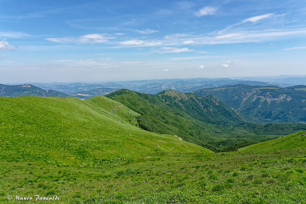Sui vasti pendii prativi sotto il Passo della Croce Arcana con vista verso la montagna del Libro Aperto.Sui vasti pendii prativi sotto il Passo della Croce Arcana con vista verso la montagna del Libro Aperto.