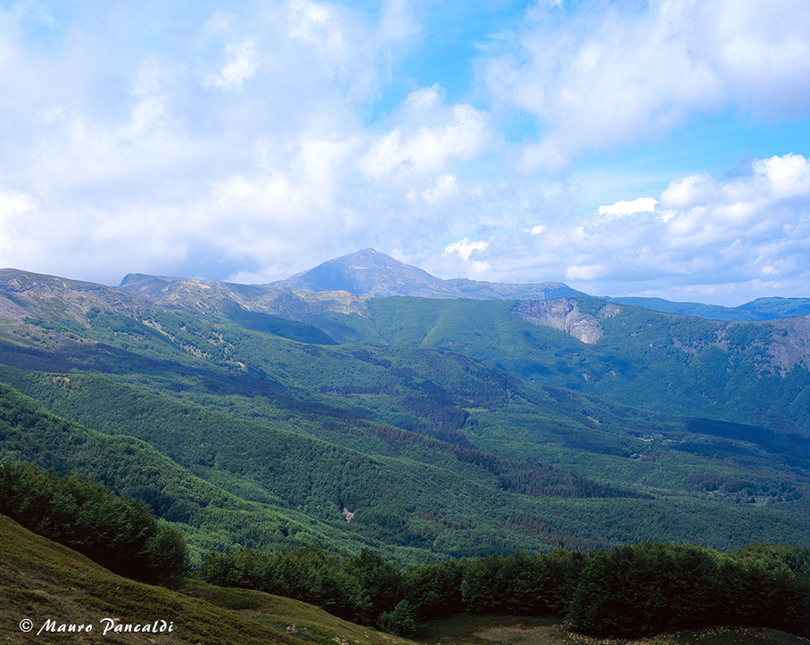 Oltre il mantello di boschi si alza all’orizzonte il Monte Cimone (dalla cresta del Cinghio Sermidano).Oltre il mantello di boschi si alza all’orizzonte il Monte Cimone (dalla cresta del Cinghio Sermidano).